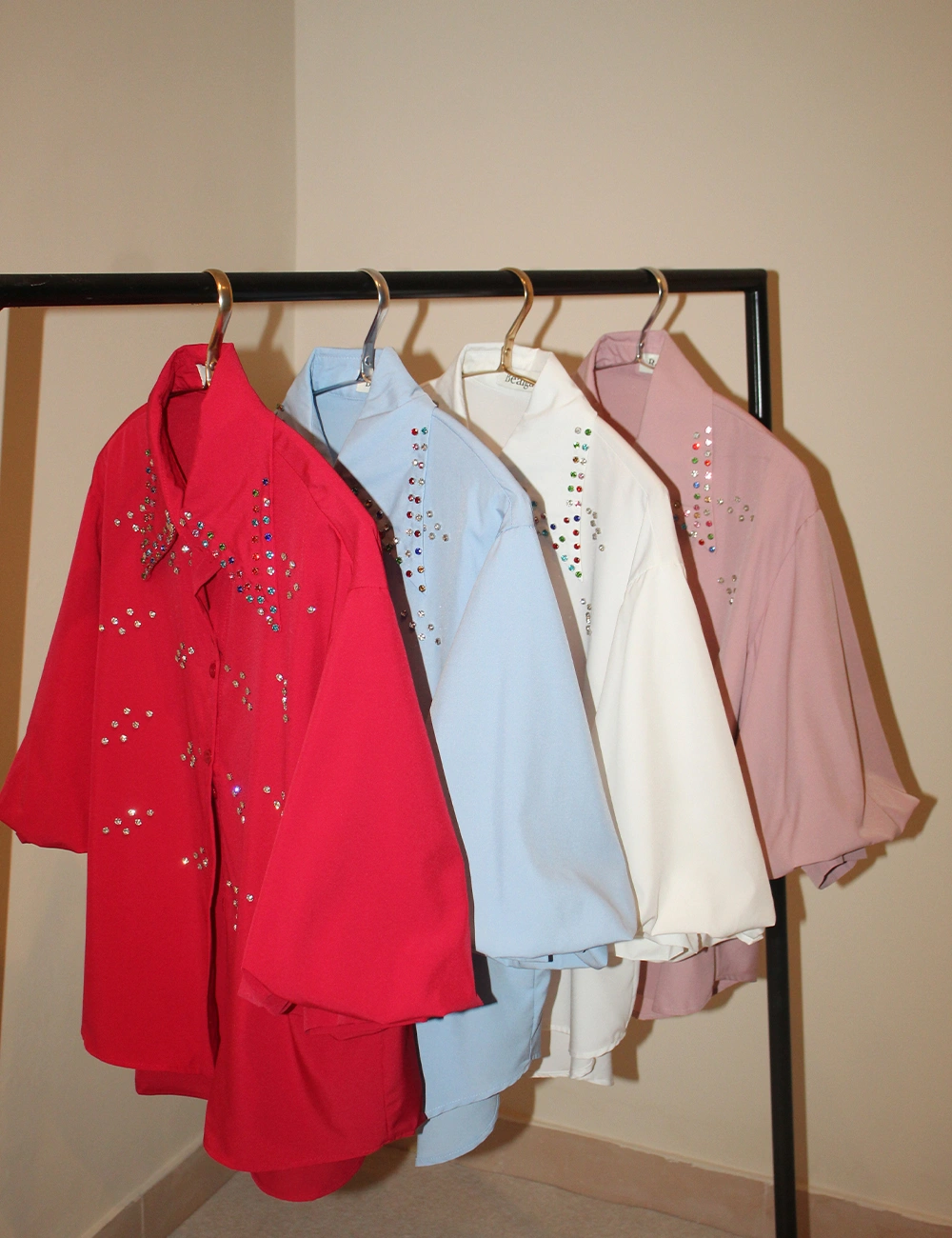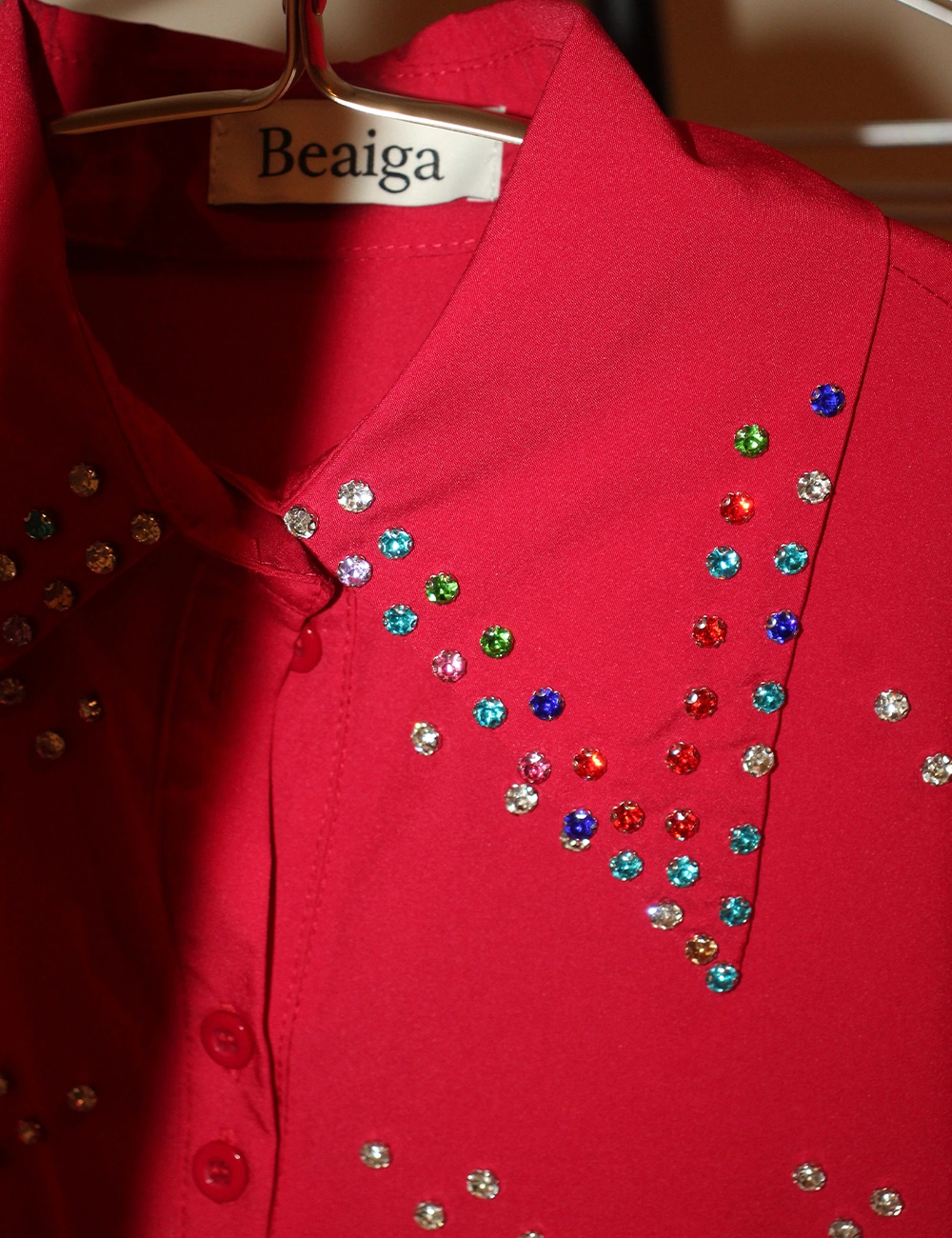 Designed to shimmer with comfort, this dress shirt features statement lantern sleeves and heavy-duty multi-colour rhinestone embellishments. All embellishments are internally locked to ensure zero skin irritation. A refined piece that transitions effortlessly from day to evening wear.